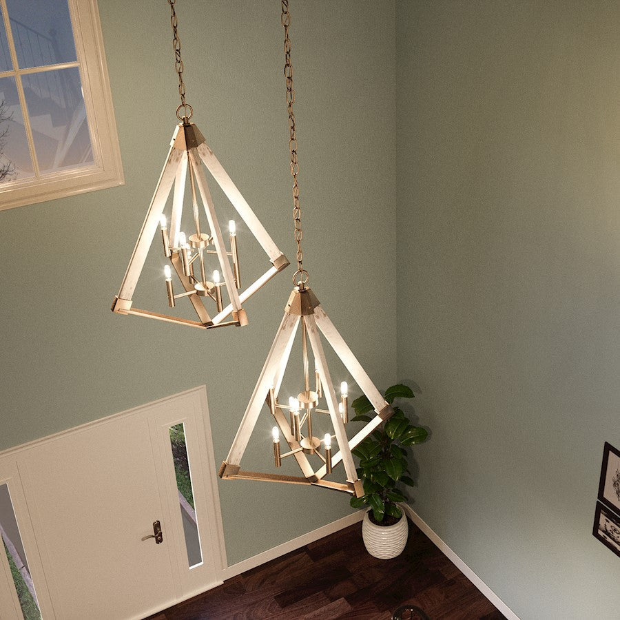 The bold lines and vintage finishes of the Viewpoint are a match made in design heaven! The inverted diamond silhouette features a faux wood frame in a whitewashed finish that is complemented by the soft brass hue of the accent caps and center column. Elongated candle sleeves and filament bulbs top off this splendidly charming collection.
