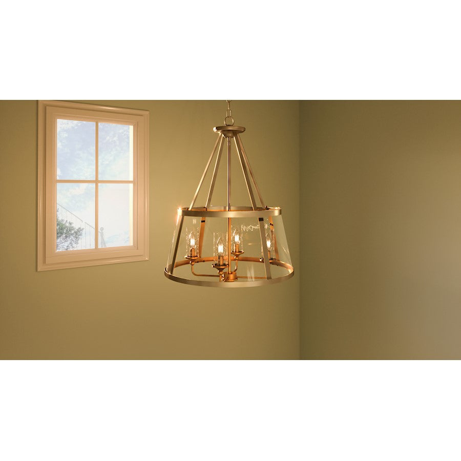 Barlow - WS Weathered Brass Finish, Pendant With 4 Lights: The Barlow's transitional design adds simple sophistication to any space. The gleaming polished nickel frame highlights the beautiful drum silhouette of the outer shade, which features clear bent glass panels. Within the drum, seedy glass surrounds each individual candle, creating a layered look that's sure to please.