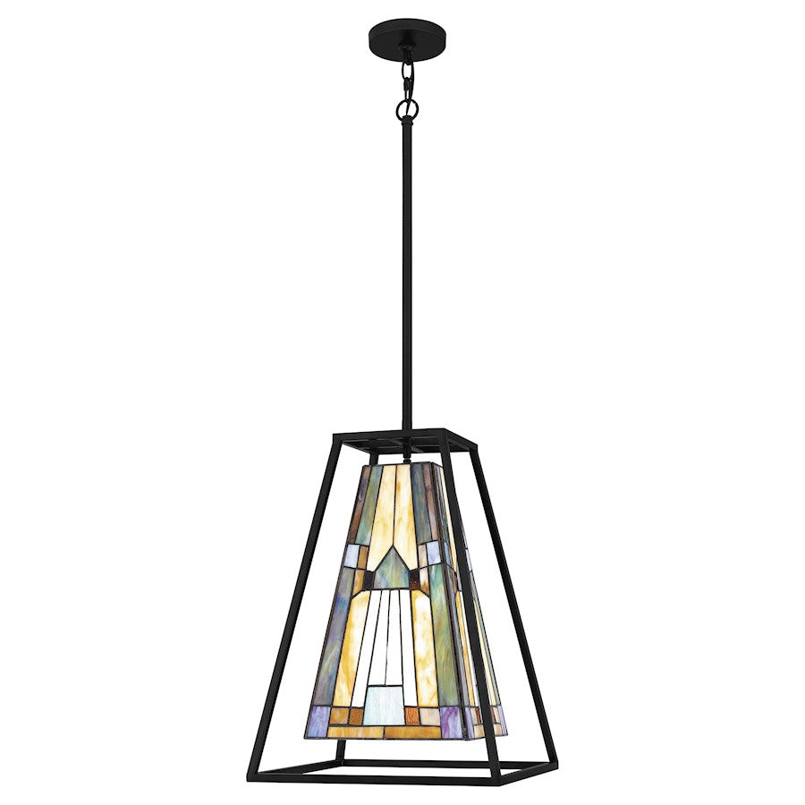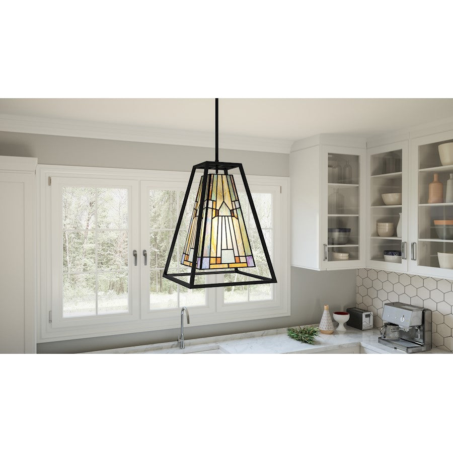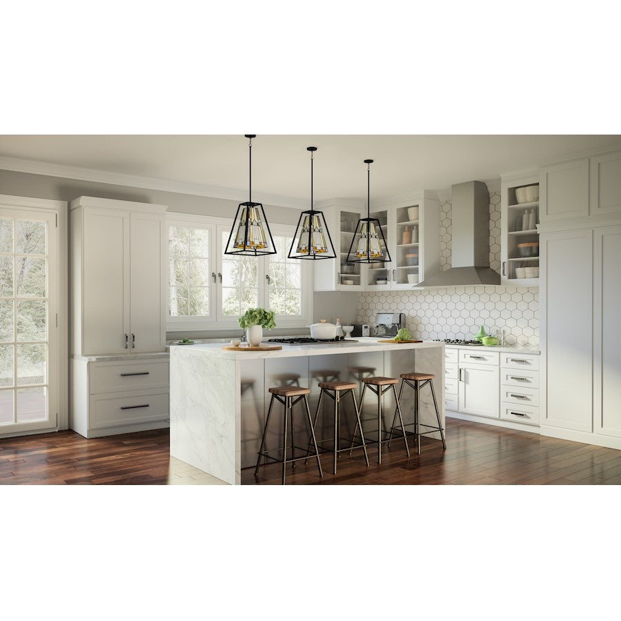 The Caledonia mini pendant showcases the intrigue of geometric forms. Reminiscent of a lantern, this piece features multicolored art glass paired with a matte black finish. The result is high contrast yet tastefully balanced.