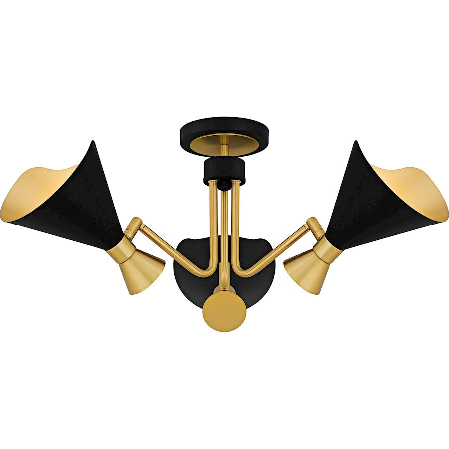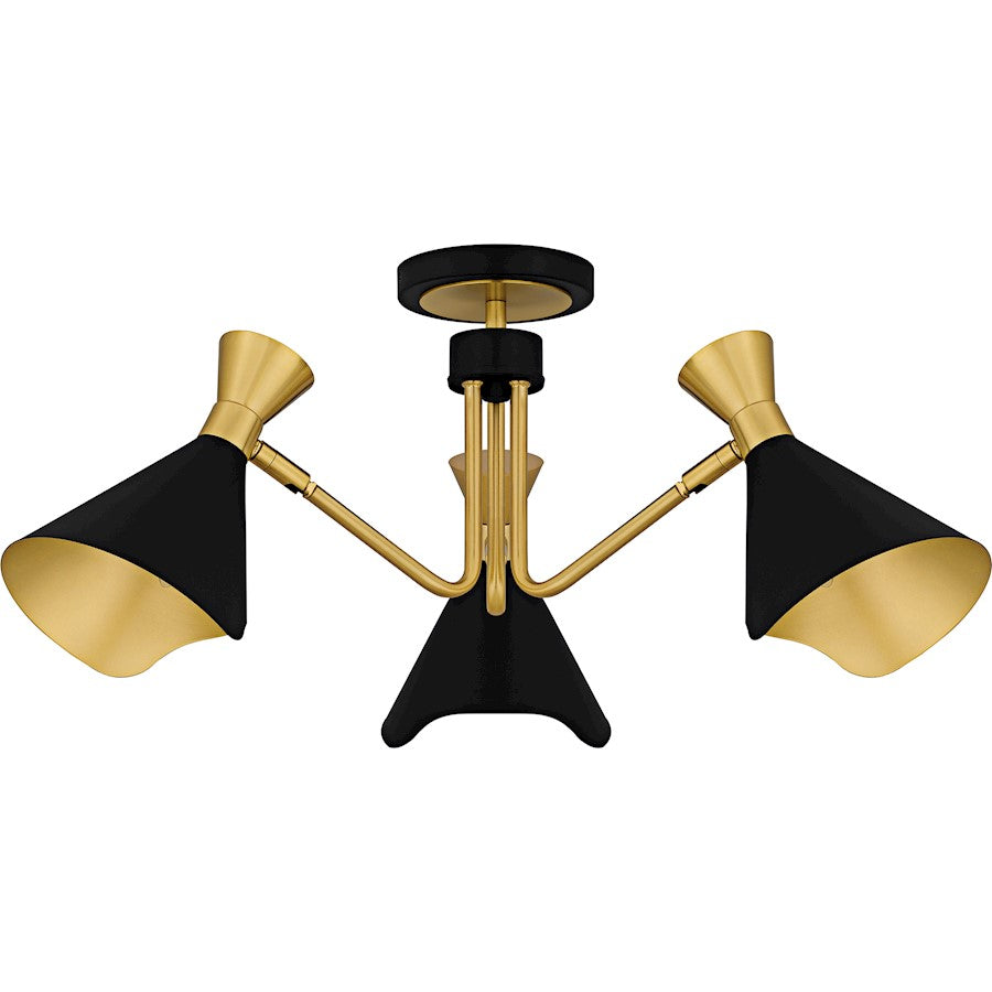 - Matte black finish highlights the modern semi-flush design and is paired with brushed gold accents for a pop of contrast