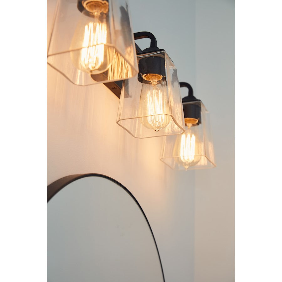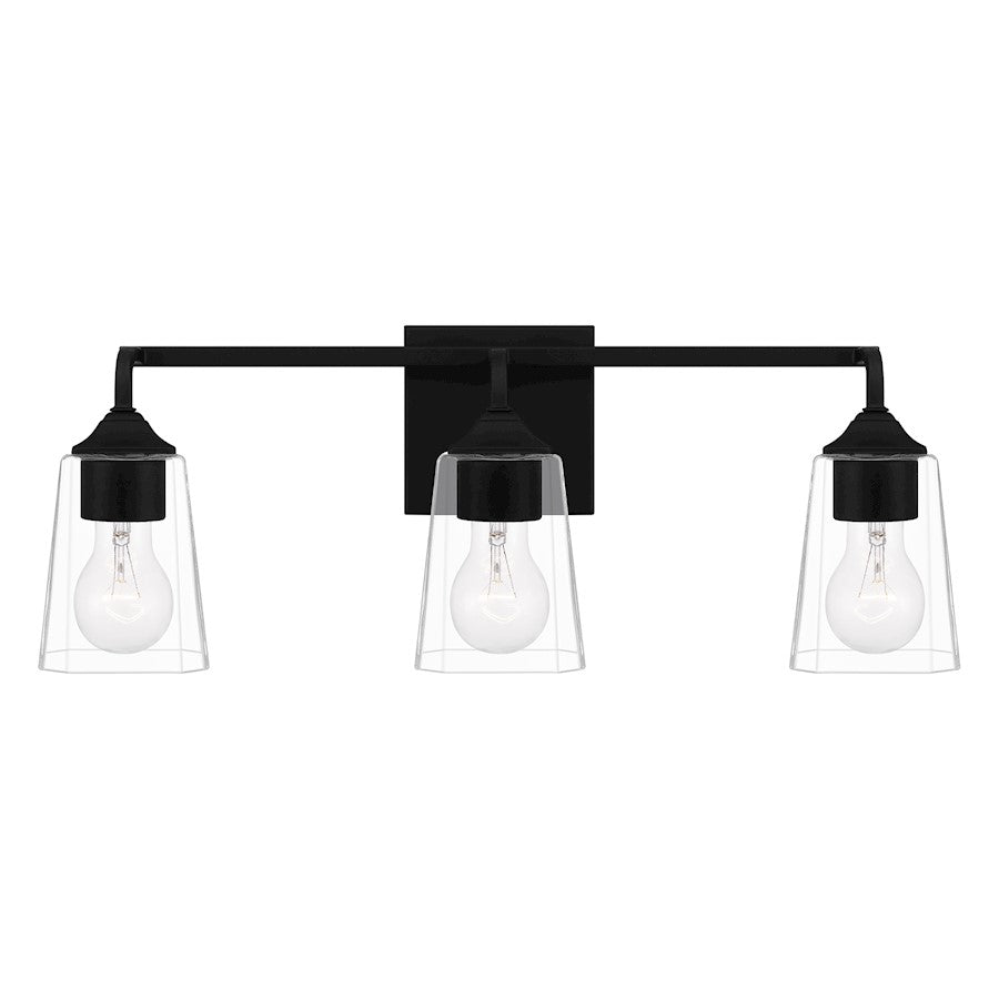 The Thoresby collection is all about choice. These bath lights come in two distinct colorways: A matte black finish with clear glass shades, or an aged brass finish with opal-etched glass. You can position them facing up or down to further tailor the look of a primary or guest bath.